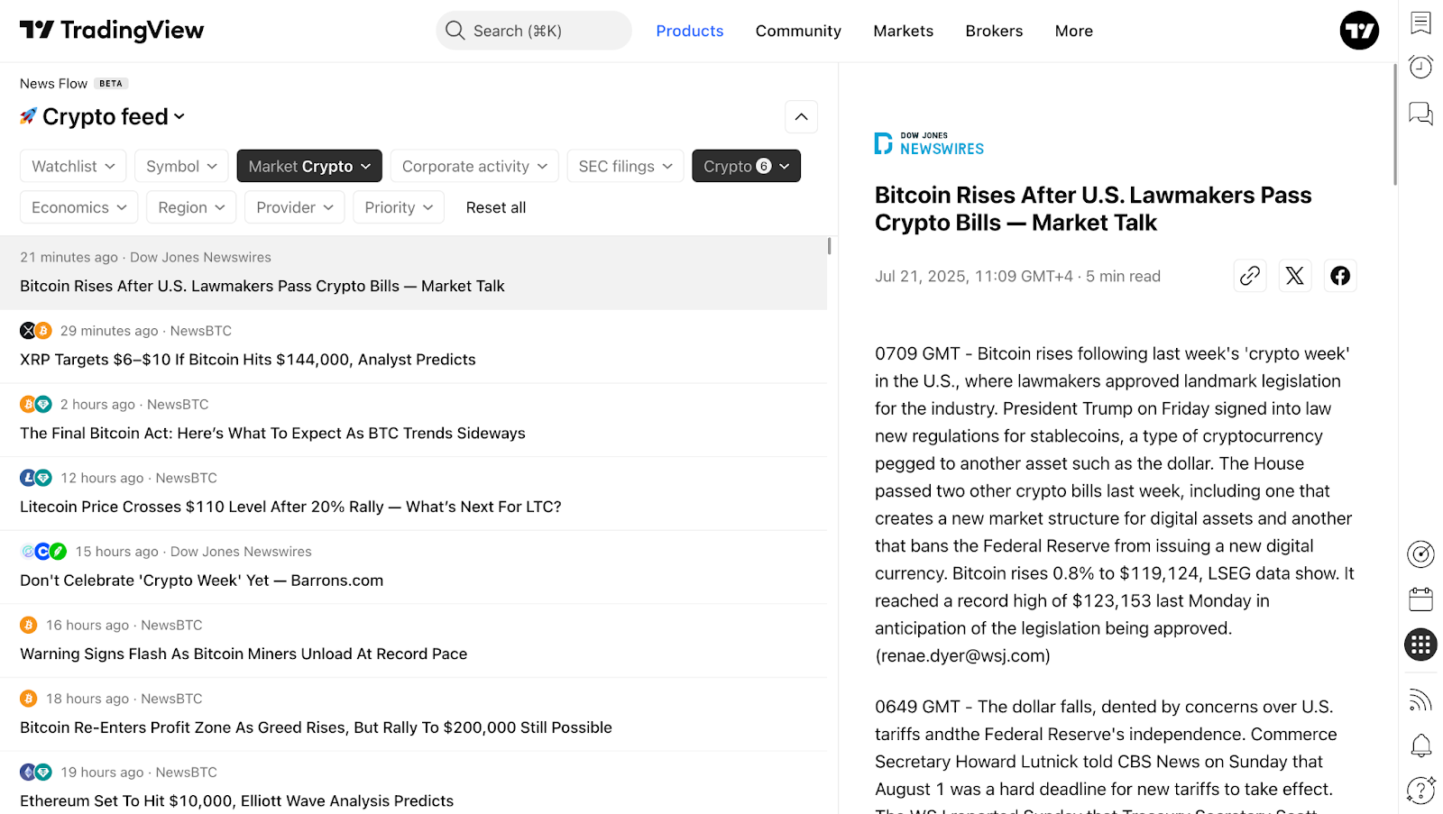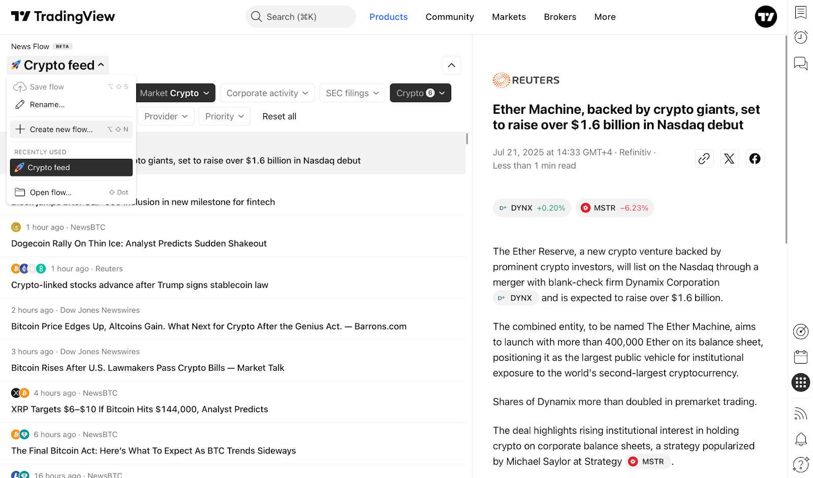 Puoi pensare al flusso di notizie come a uno degli screener di TradingView, dove tutte le notizie relative al mondo del trading e degli investimenti sono raccolte in un unico posto. Puoi impostare vari filtri per ordinare gli articoli e comprendere meglio quali sono le dinamiche di mercato sottostanti. Inoltre, puoi accedere agli articoli da diverse parti della nostra piattaforma e leggere gli aggiornamenti sull'attuale stato del mercato non appena vengono pubblicati.