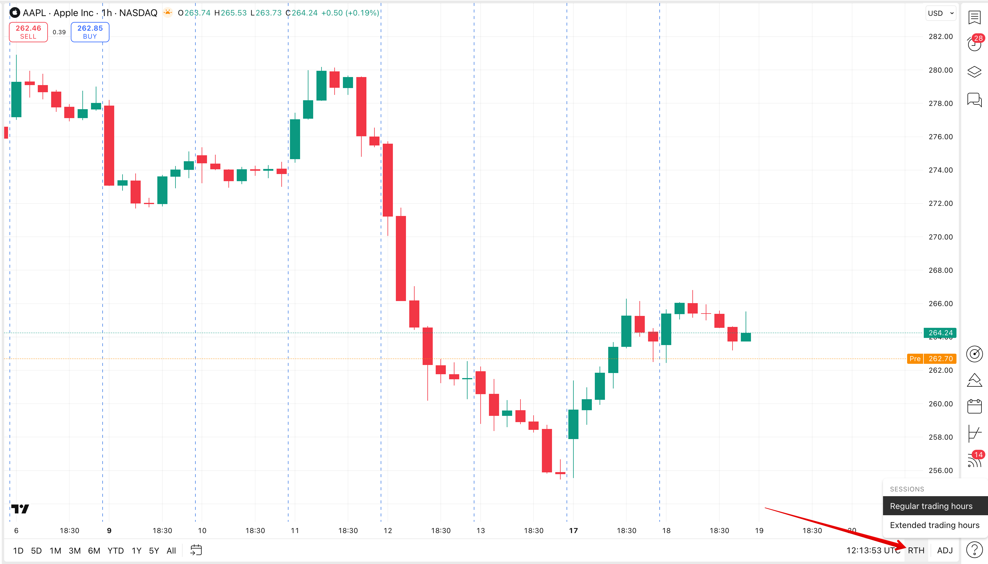 Importante: Gli alert su watchlist vengono calcolati solo per i grafici che abbiano selezionata la sessione di negoziazione regolare (o "Regular Trading Session", RTH), e si attivano di conseguenza. Puoi passare alla sessione RTH in questo modo: