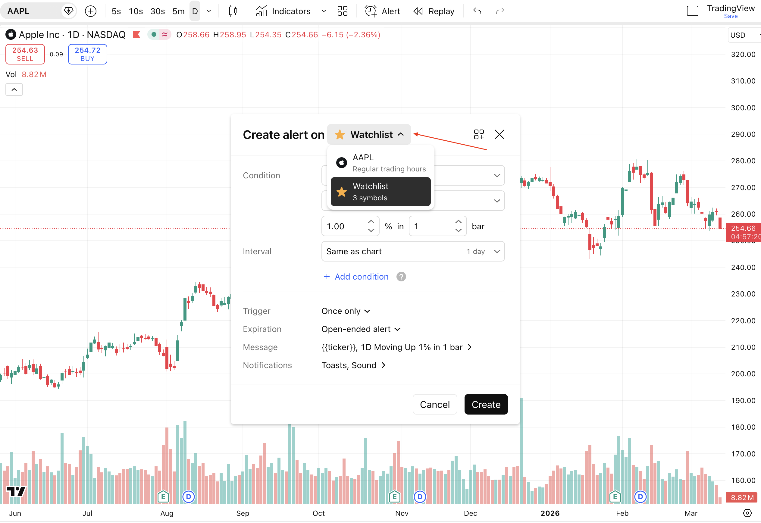 Si attiverà anche se aggiungi un simbolo dopo aver creato l'alert. Se rimuovi un simbolo dalla watchlist, l'alert non sarà più applicabile ad esso. Ciò garantisce che i tuoi alert riflettano sempre l'insieme più aggiornato di simboli presenti nella tua watchlist.