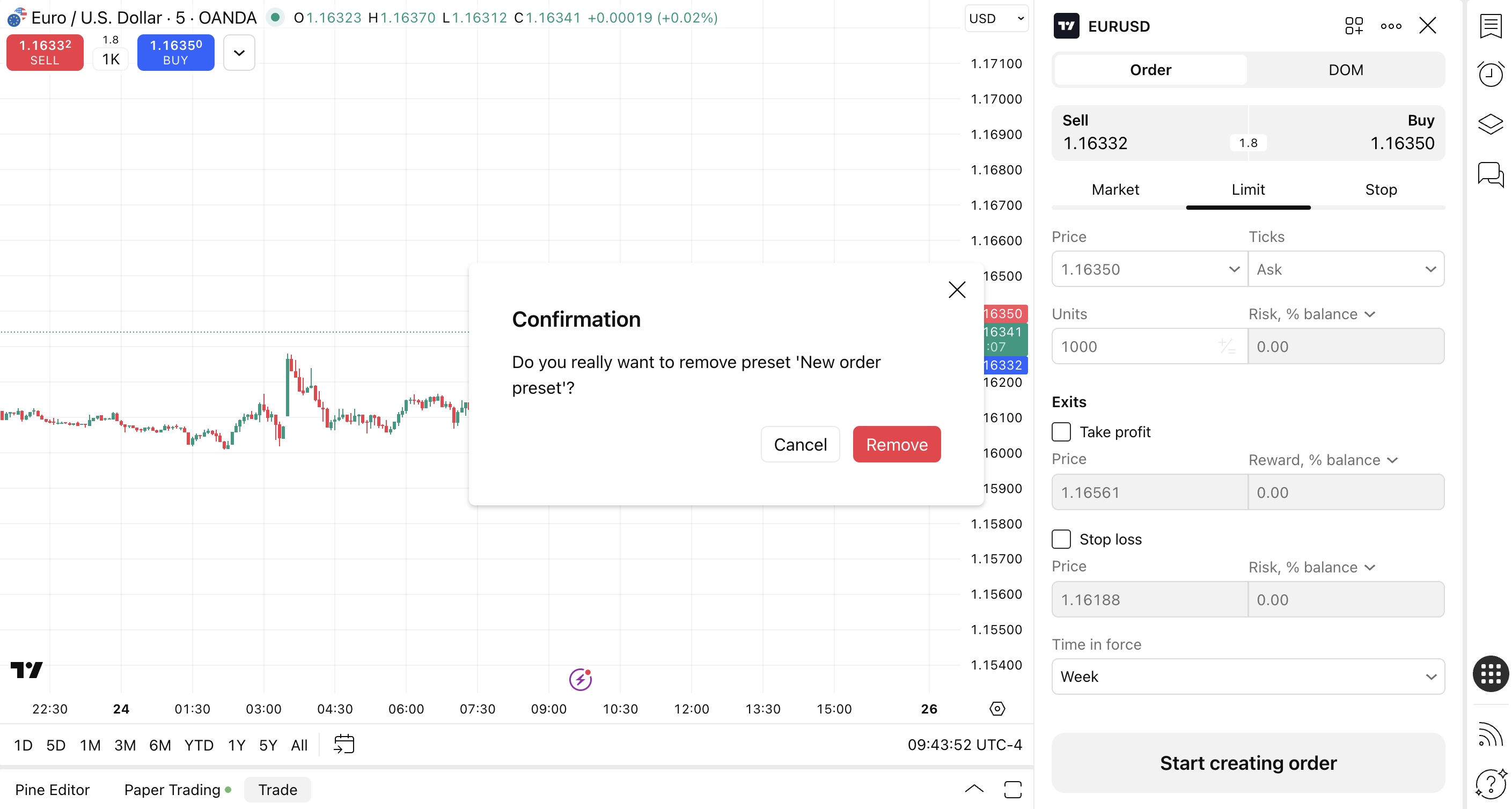 How to delete a created preset?A preset can be deleted through the preset menu in the Order Window by clicking the Delete button.Più vecchiPiù vecchiHow to edit a created preset?AvantiAvantiOrdini a mercatoLancia grafico