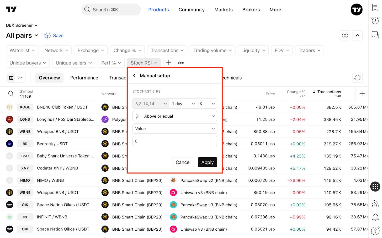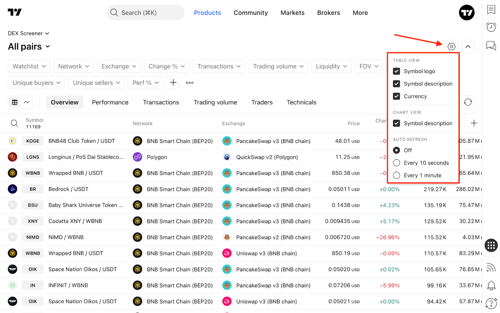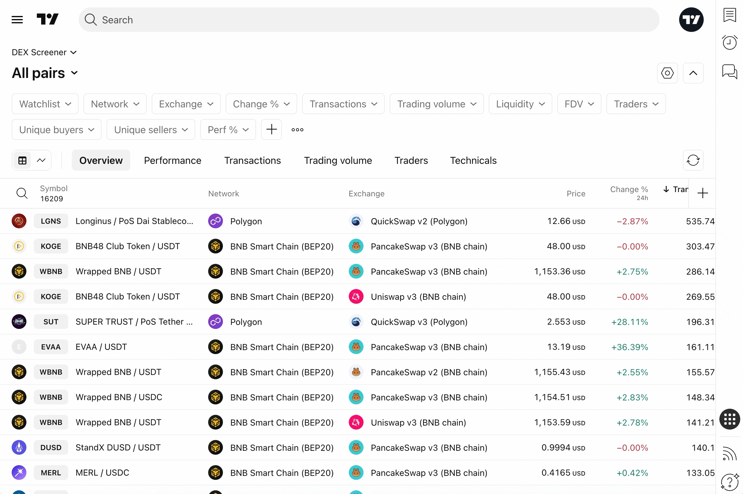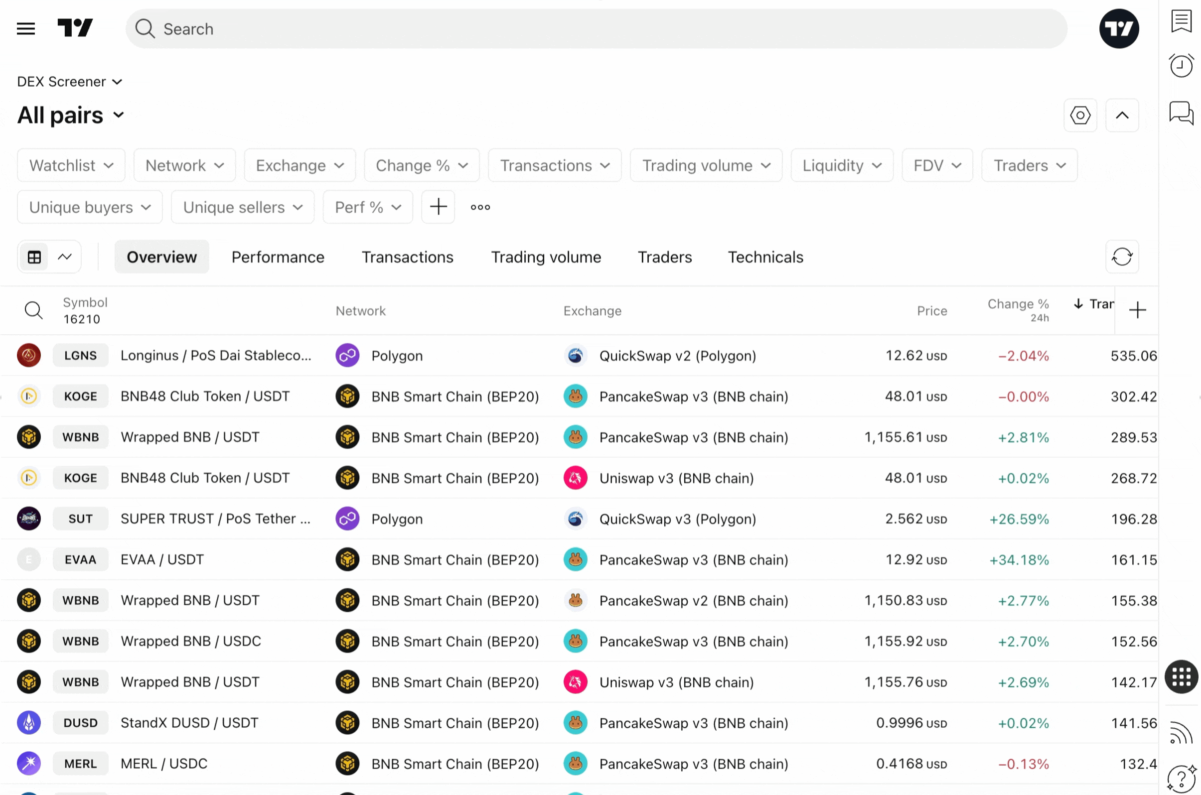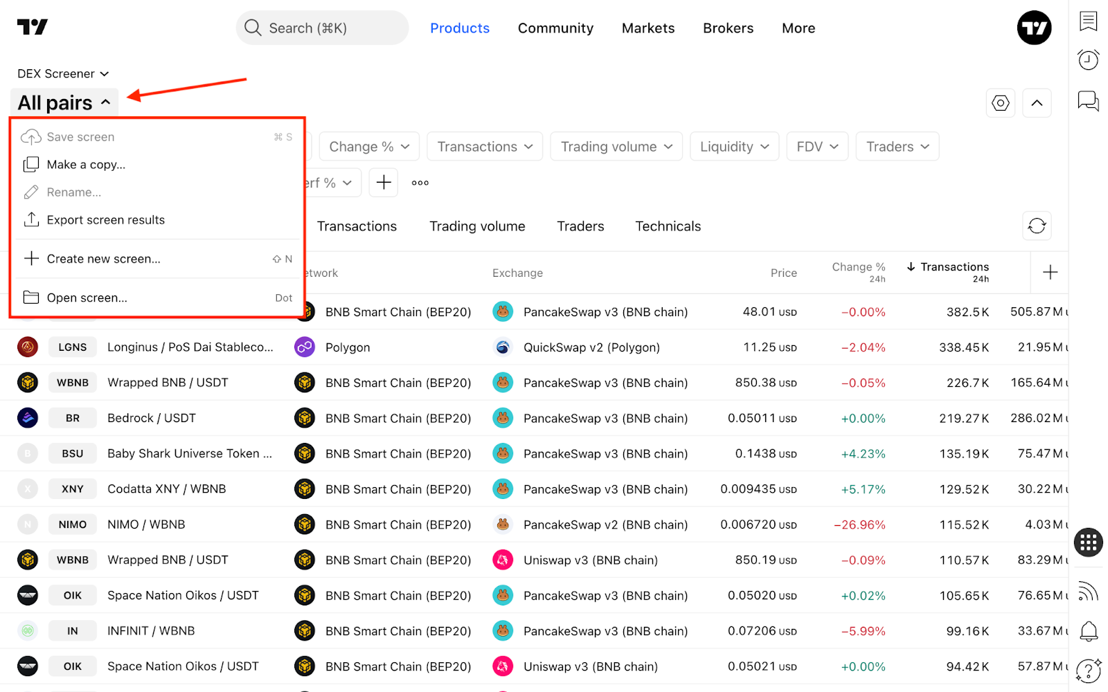 Quando apri lo screener, vedrai tutte le coppie disponibili su TradingView, negoziate sui principali exchange decentralizzati. Tutte le criptovalute presenti sulla nostra piattaforma sono qui, ordinate in base al volume di scambi delle ultime 24 ore. Puoi modificare il metodo di ordinamento con i set di filtri predefiniti per personalizzare la tua ricerca. Nell'angolo in alto a sinistra, clicca su “Tutte le coppie” → “Apri schermata...”.