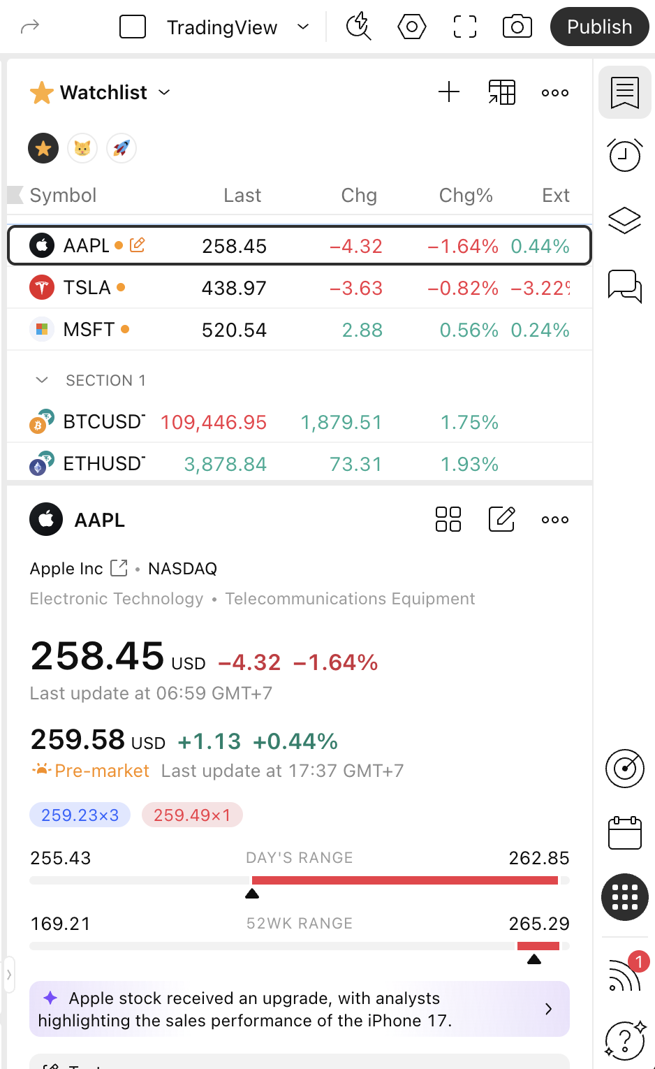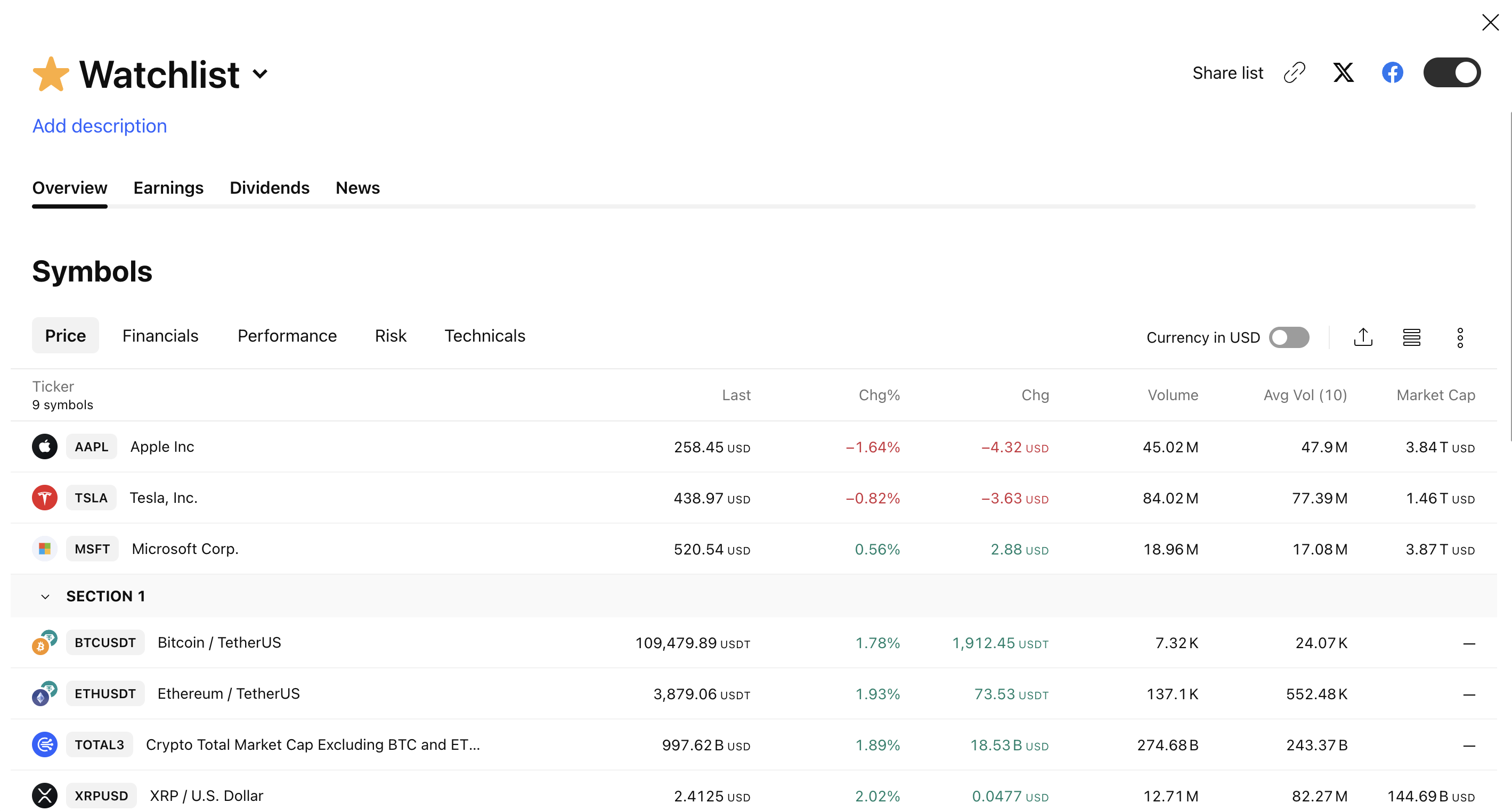 Le watchlist di TradingView possono essere aperte dalla barra degli strumenti di destra. Vengono visualizzati i dati essenziali, tra cui l'ultimo prezzo, la variazione di prezzo e altre statistiche che si possono personalizzare nelle impostazioni.