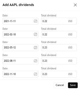 Per rivedere e aggiungere un dividendo, clicca su Aggiungi al mio portafoglio, modifica le date e l'importo del dividendo se necessario (di solito non sono necessarie modifiche, poiché il suggerimento tiene già conto di tutte le caratteristiche del tuo portafoglio), quindi clicca su Salva.