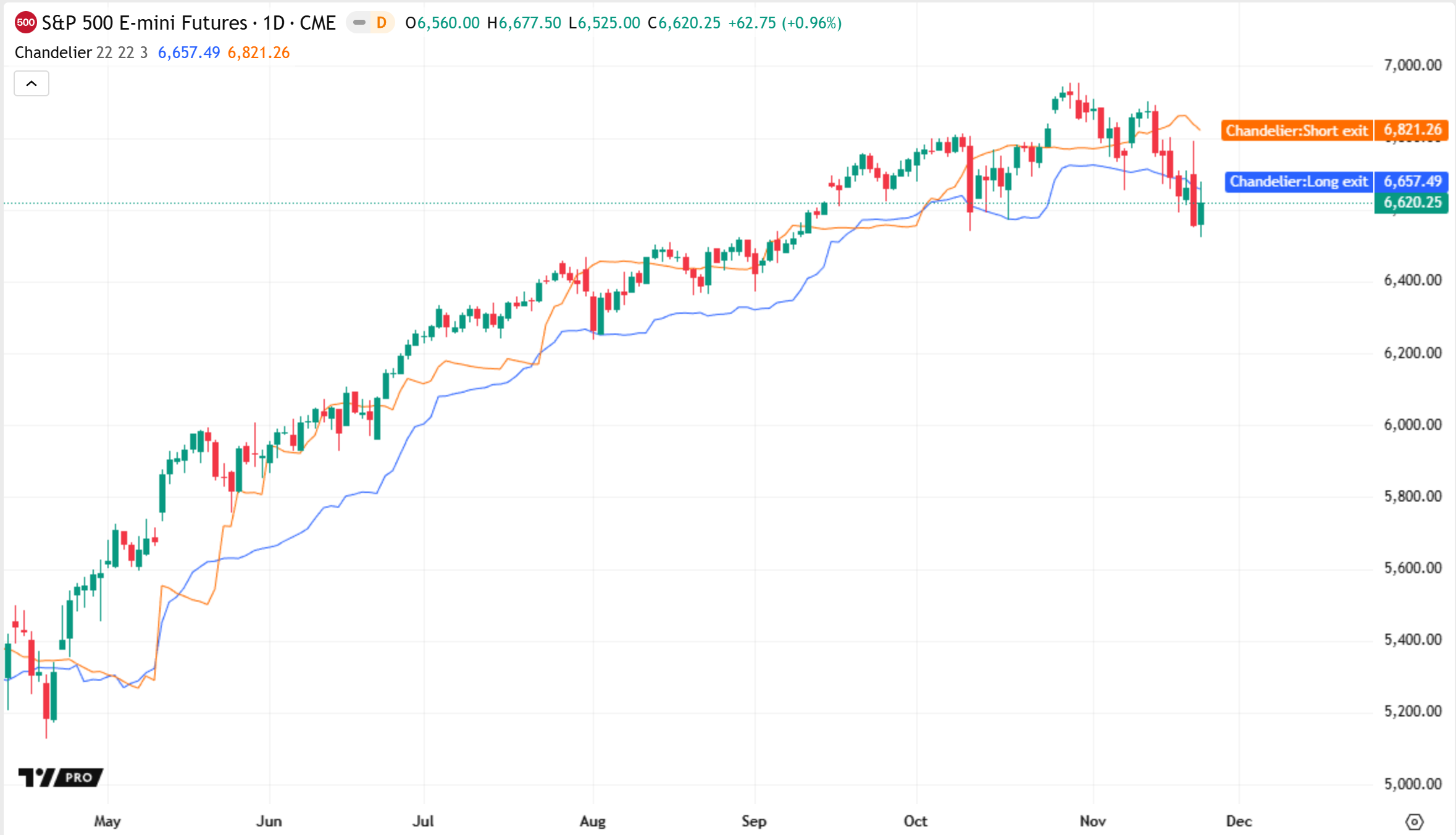 Il Chandelier Exit, creato da Charles Le Beau e reso popolare da Alexander Elder, è un indicatore basato sulla volatilità che identifica i punti di uscita dello stop loss sulla base dei prezzi estremi locali e dell'Average True Range (ATR). Lo scopo dell'indicatore è aiutare i trader a rimanere in un'operazione che segue il trend fino al potenziale inizio di un'inversione di tendenza significativa.
