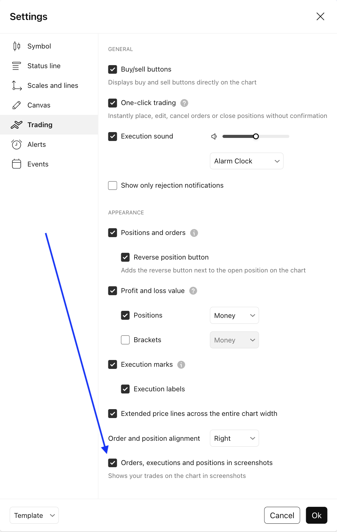 Per rendere visibili le tue operazioni quando salvi o condividi un grafico tramite il menù Istantanea grafico, attiva l'opzione Ordini, esecuzioni e posizioni negli screenshot.