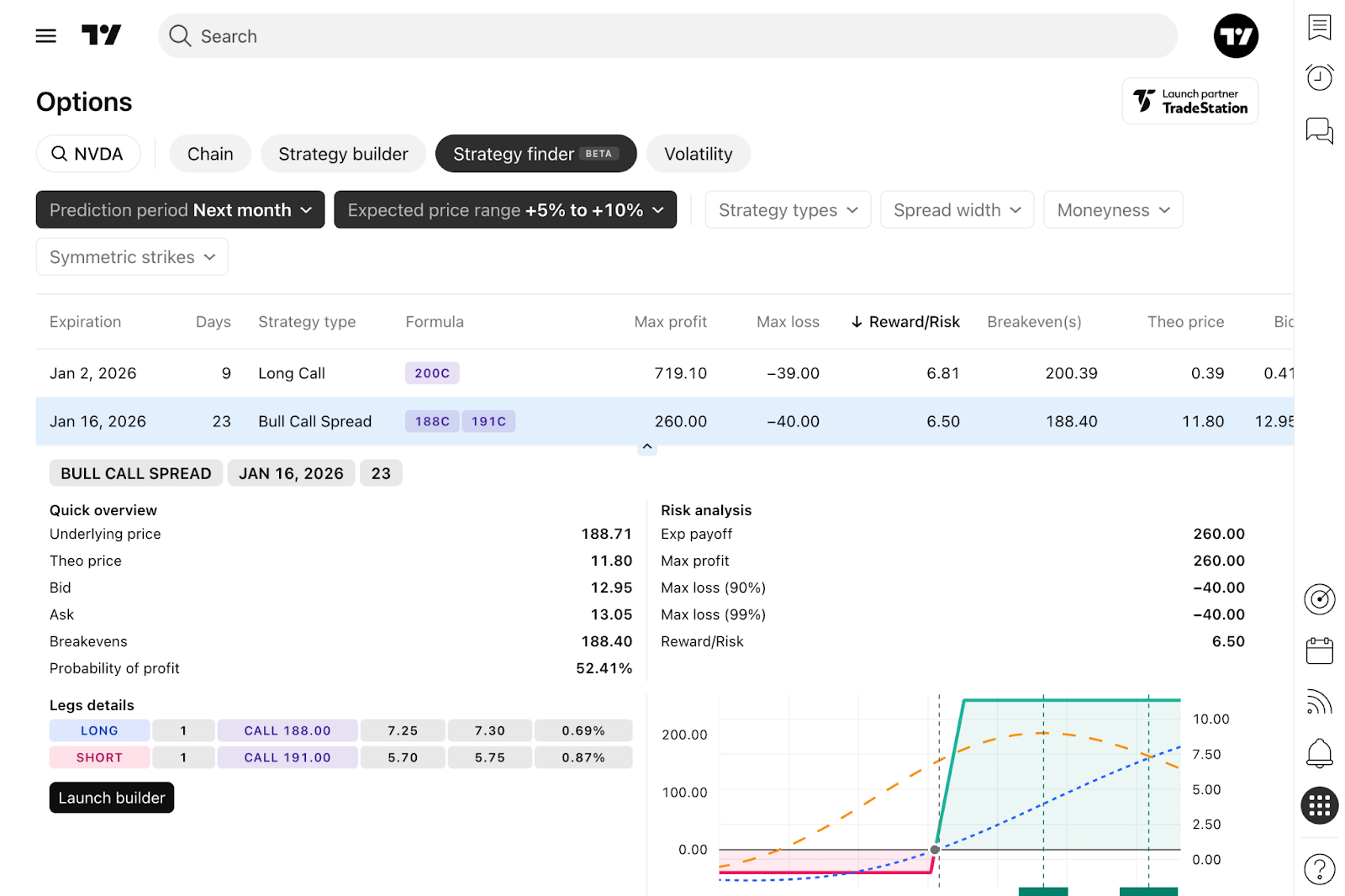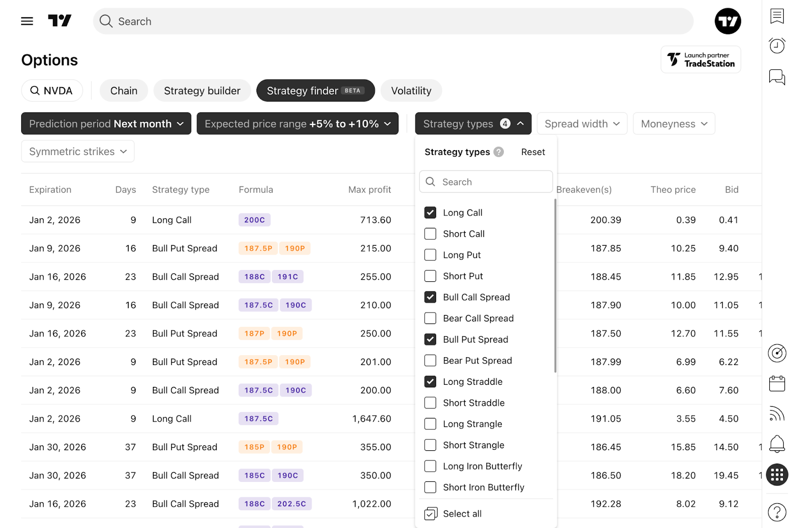 Quando apri la scheda Strategy finder opzioni per la prima volta, viene selezionato uno strumento predefinito. Verrà visualizzata una tabella che mostra le strategie di opzioni per il mese successivo, basate su una variazione di prezzo prevista compresa tra +5% e +10%.