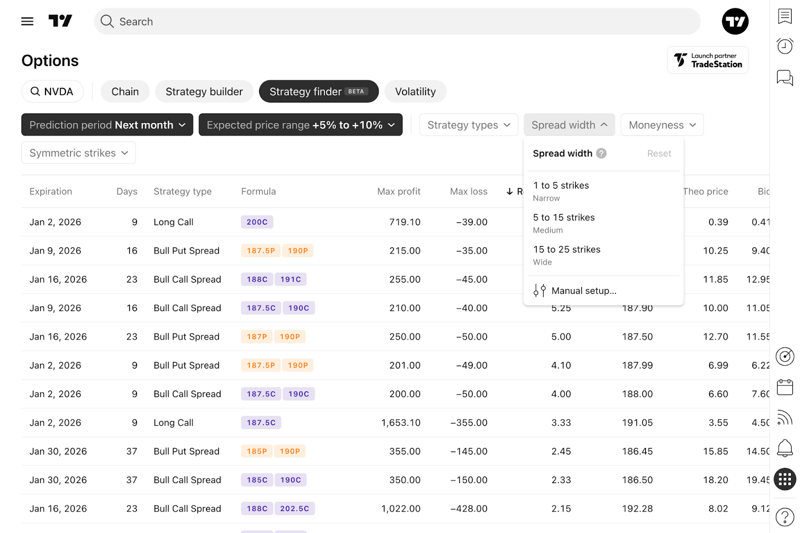 Per limitare la distanza tra gli strike in una strategia, regolare il filtro Larghezza spread e scegliere una larghezza appropriata, misurata in numero di strike. Questo filtro si applica istantaneamente a tutte le strategie di opzioni che utilizzano il parametro larghezza.