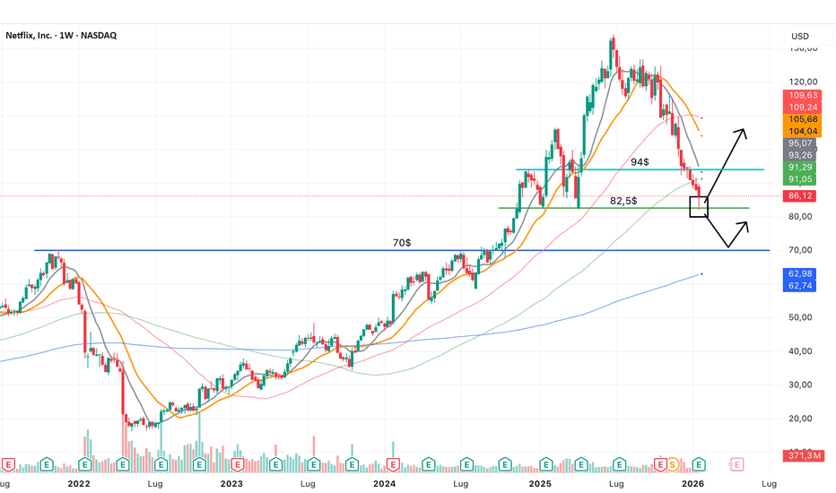 Netflix -37% dai massimiNetflix preoccupa il mercato che la riporta sul primo supporto a 80 dollari. Erano i prezzi di inizio 2025.
